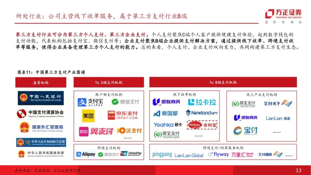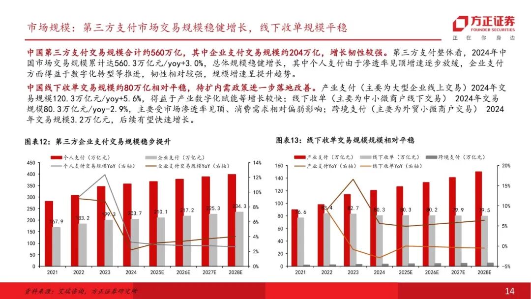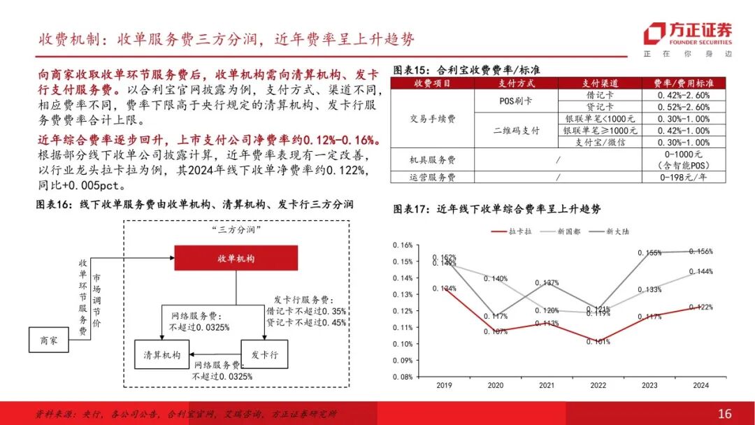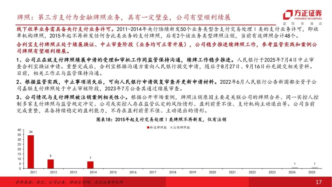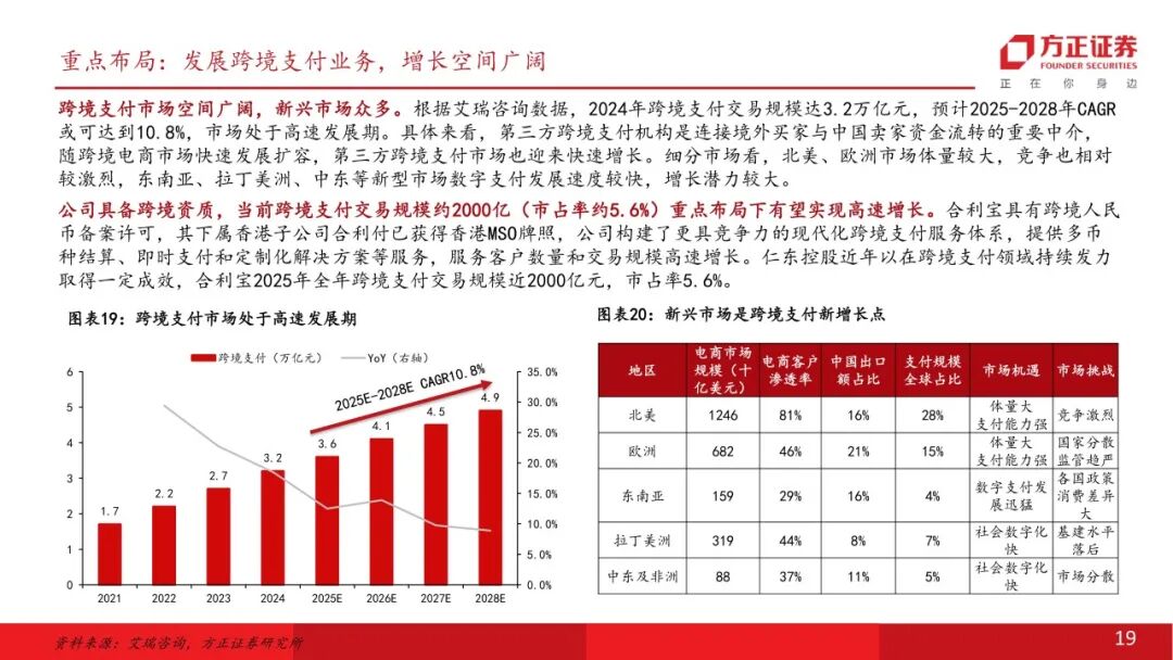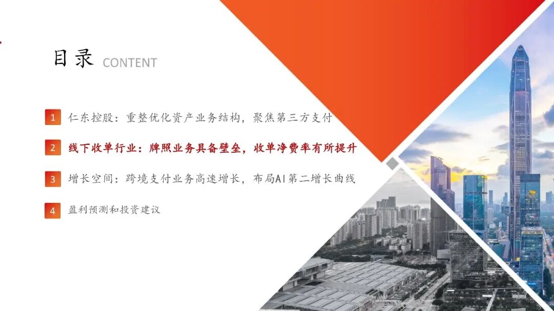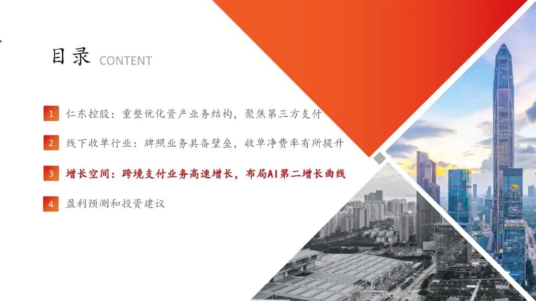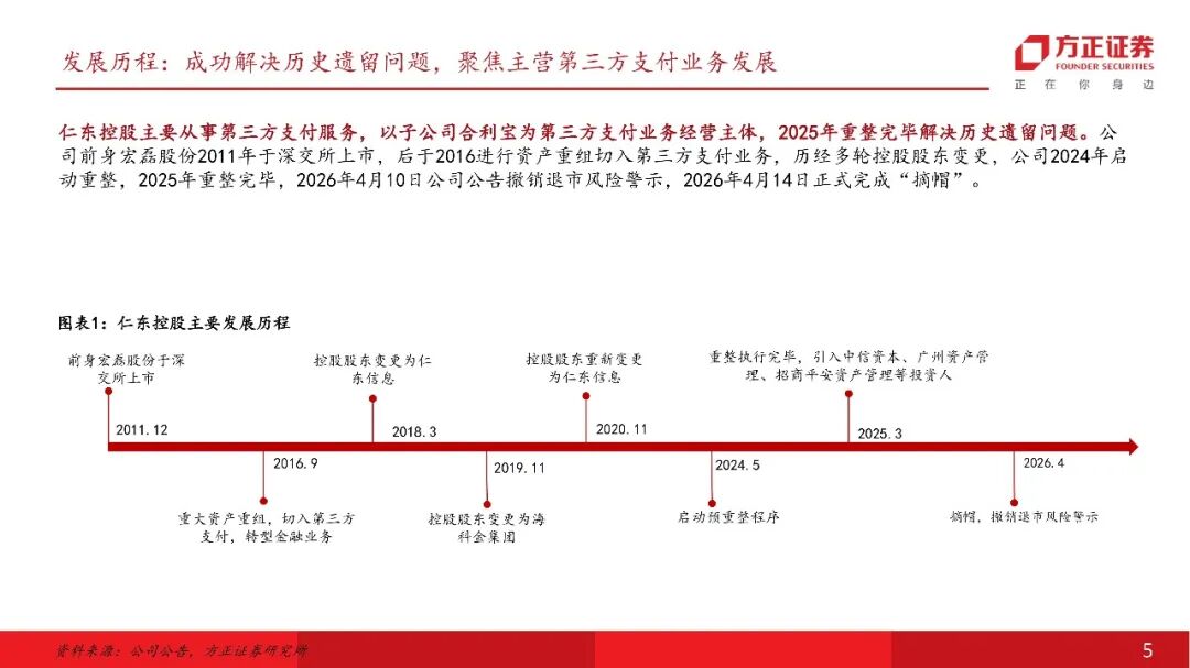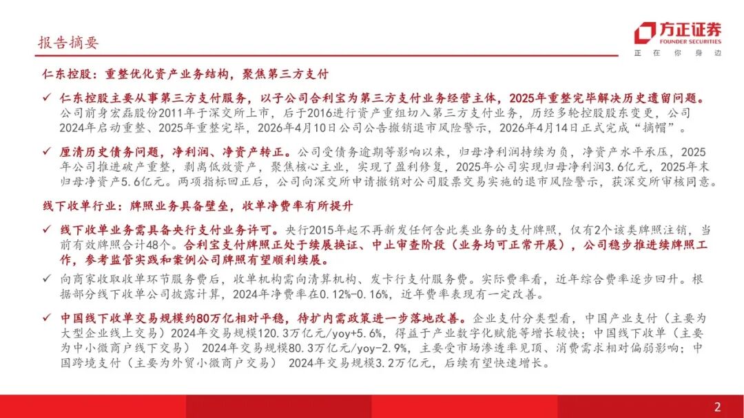 仁东控股:重整优化资产业务结构,聚焦第三方支付仁东控股主要从事第三方支付服务,以子公司合利宝为第三方支付业务经营主体,2025年重整完毕解决历史遗留问题。公司前身宏磊股份2011年于深交所上市,后于2016进行资产重组切入第三方支付业务,历经多轮控股股东变更,公司2024年启动重整、2025年重整完毕,2026年4月10日公司公告撤销退市风险警示,2026年4月14日正式完成“摘帽”。线下收单行业:牌照业务具备壁垒,收单净费率有所提升线下收单业务需具备央行支付业务许可。央行2015年起不再新发任何含此类业务的支付牌照,当前有效牌照合计48个。合利宝支付牌照正处于续展换证、中止审查阶段(业务均可正常开展),公司稳步推进续牌照工作,参考监管实践和案例公司牌照有望顺利续展。 向商家收取收单环节服务费后,收单机构需向清算机构、发卡行支付服务费。实际费率看,近年综合费率逐步回升。根据部分线下收单公司披露计算,2024年净费率在0.12%-0.16%,近年费率表现有一定改善。增长空间:跨境支付业务高速增长,布局AI第二增长曲线跨境支付市场空间广阔,新兴市场众多,公司具备跨境资质,合利宝2025年跨境支付交易规模约2000亿(市占率约5.6%),重点布局下有望实现高速增长。根据艾瑞咨询数据,中国2024年跨境支付交易规模达3.2万亿元,预计2025-2028年CAGR或可达到10.8%,市场处于高速发展期。合利宝具有跨境人民币备案许可,其下属香港子公司合利付已获得香港MSO牌照,近年已在跨境支付领域持续发力取得一定成效。 公司成立三家全资子公司作为AI项目储备公司,适时布局相关产业,1亿元战略投资江原科技。公司积极谋划第二增长曲线,2025年成立深圳仁东智算科技有限公司、北京仁东数域科技有限公司、乌兰察布仁东智算科技有限公司等子公司。江原科技专注全国产 AI 芯片研发,实现了先进自主设计、工艺制造、封装的本土化全流程,仁东控股战略投资江原科技1亿元(已实缴6000万元),对应持股比例4.1427%。首次覆盖给予“推荐”评级。仁东控股正式摘帽,主业来看公司具备稀缺的第三方支付牌照,已在线下收单行业深耕多年,具备壁垒,公司剥离低效资产专注主业后,线下收单业务有望迎来修复性增长。增长空间来看,跨境支付市场空间广阔,仁东具备相关资质,并已在该领域取得一定成效,后续收入有望较快增长,同时公司已设立子公司布局智算方向,并战略投资国产AI芯片公司,有望逐步打造第二增长曲线。风险提示:支付牌照续展进度不及预期;重整后第二增长曲线推进不及预期;市场竞争加剧。